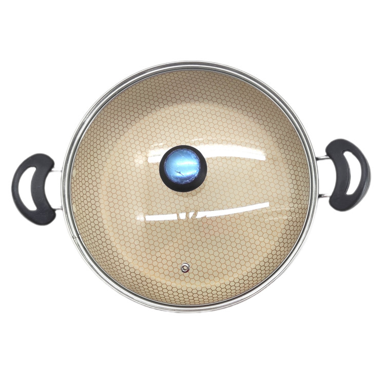 تابه NC سایز ۳۰ دارای دو دسته جهت سهولت حمل و درب پیرکس سوپاپ دار بوده ،طراحی کف ظرف زنبوری بشکل زنبوری است رنگبندی کوره ای جذاب و مقاوم در برابر حرارت از دیگر مزایای این محصول می باشد .